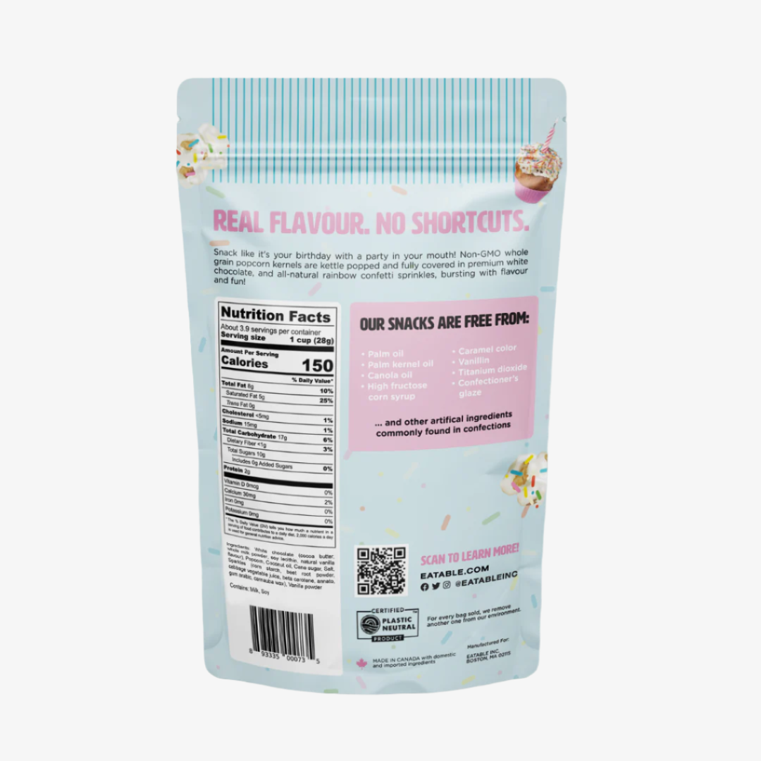 Snack like it's your birthday any day and keep the party POPPIN' with Birthday Cake Pops! Non-GMO whole grain popcorn kernels are kettle popped and fully covered in premium white chocolate and all-natural rainbow confetti sprinkles, bursting with flavour and fun!